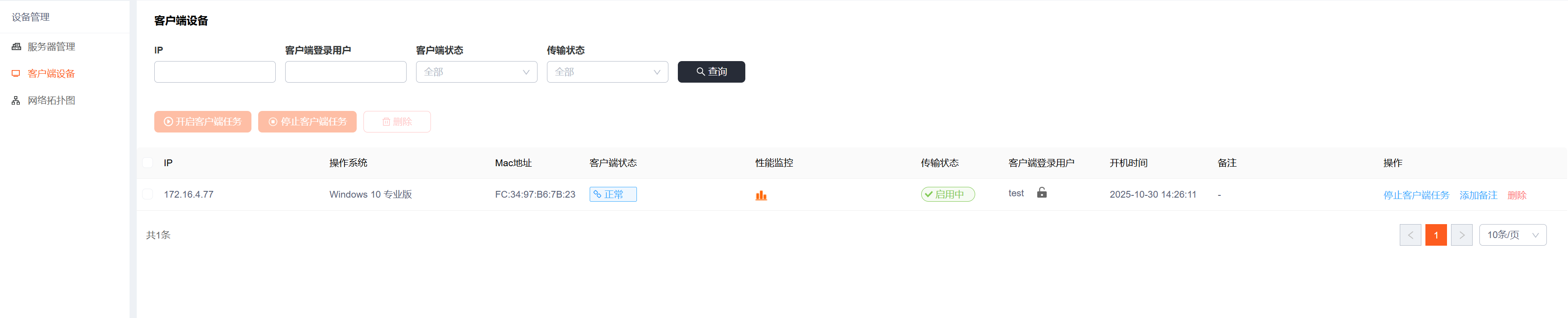 传输设置管理管理展示了连接服务器的客户端及所在机器的运行状态,监控机器的CPU、内存、磁盘利用率, 并可以对连接节点的所有传输任务一键停止和启动、锁定客户端用户的操作。
