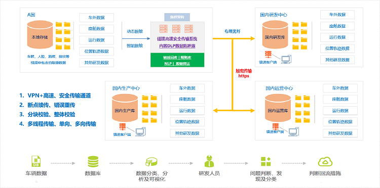 2、不同车型在不同国家销售都会涉及到路测数据的采集,往往路测数据量较多、且较大,这些数据需要及时传输到国内相关部门研判,由于跨境传输带宽利用效率低下,严重影响数据传输效率;