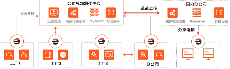 打造动漫供应链一体化高效协作平台 根据项目情况,我们在其总部部署镭速服务器端,在工厂和公司分部部署网页端,实现跨国文件快速交互。
