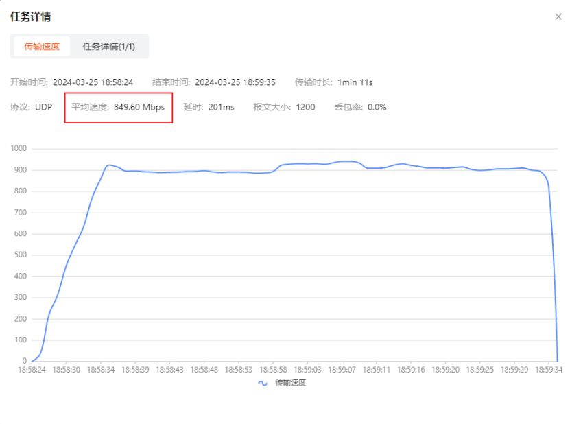 调整后,传输速度可达到849.60Mbps。