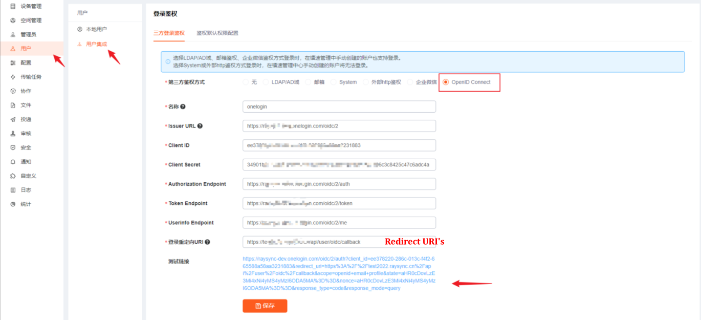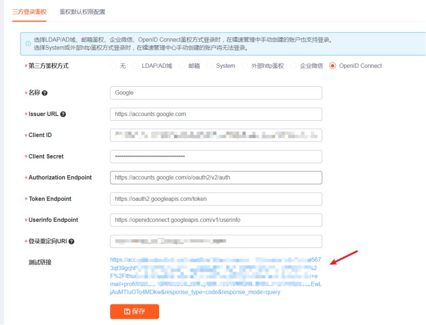 将以上信息填入镭速oidc 鉴权配置中,并点击保存