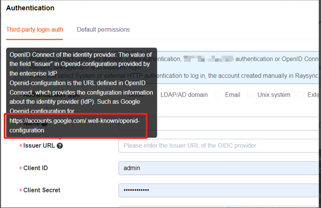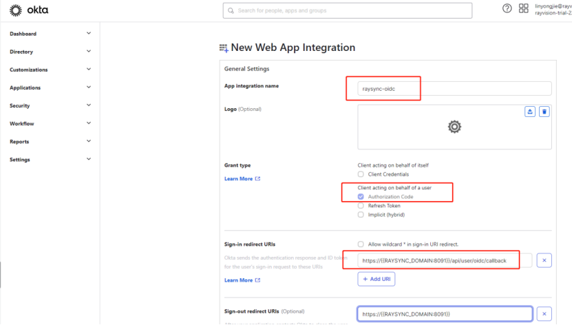 您的镭速服务前台地址 + /api/user/oidc/callback https://{{RAYSYNC Top-level domain:8091}}/api/user/oidc/callback |