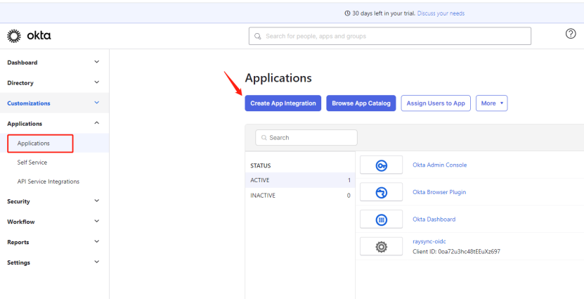 1)登录您的okta管理页面,在左侧菜单栏找到Applications,并点击Create APP Integration