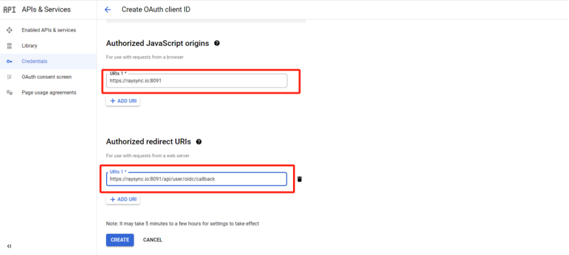 6)填写Authorized JavaScript origins和Authorized redirect URIs