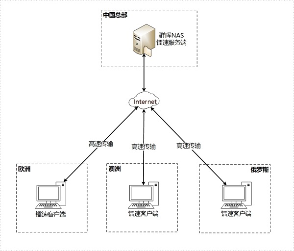 镭速为杭州亚锐总部与全球各地之间提供传输解决方案,通过镭速自研传输协议助力总部日常与全球各地的数据的高速传输。总部群晖NAS上部署镭速服务端系统,全球各地自动驾驶基地部署镭速客户端,实现总部与各地之间的文件高速传输。