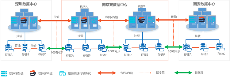 1、在深圳、南京、西安三地分别部署镭速传输系统,各个节点分别挂载本中心的存储;