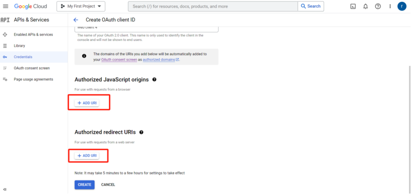 6)填写Authorized JavaScript origins和Authorized redirect URIs
