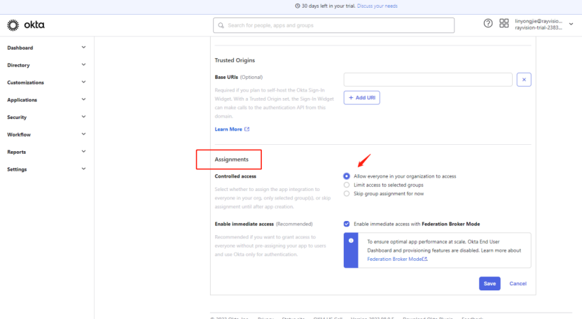 4)确定授权范围,默认选择如下,运行okta 的所有用户,选择完成后点击Save