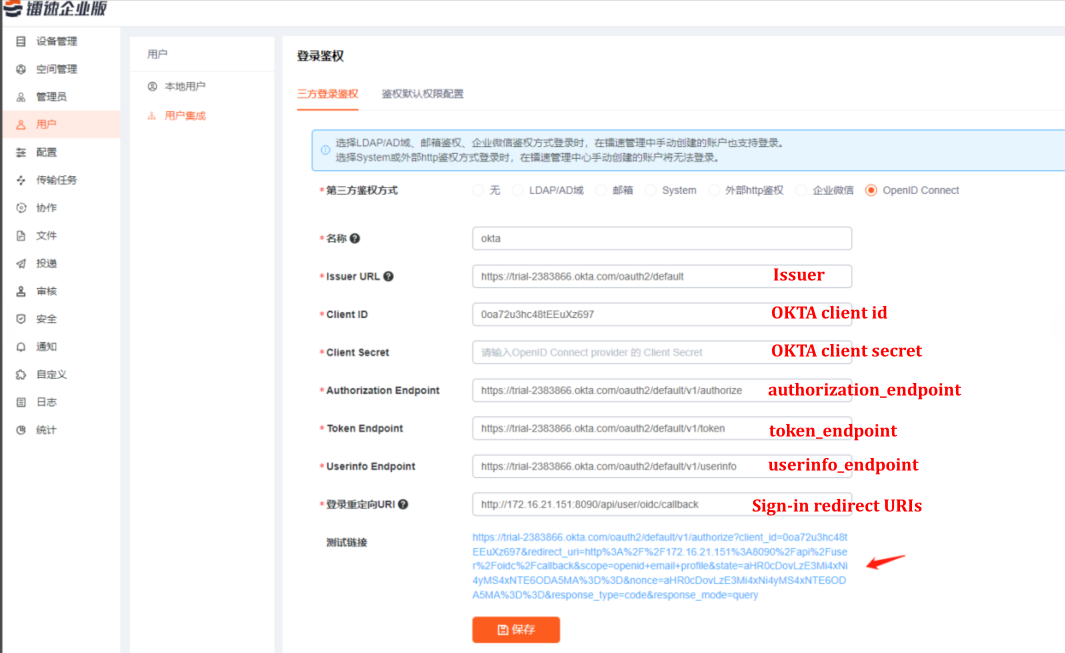将以上信息填入镭速oidc 鉴权配置中,并点击保存