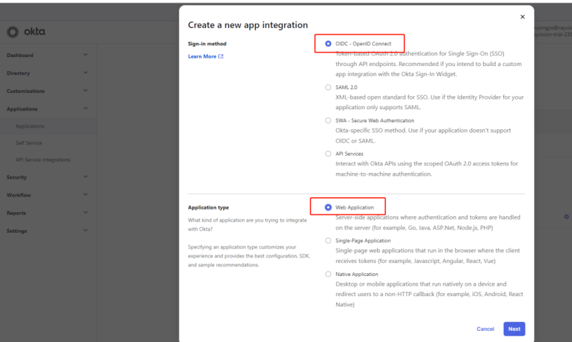 2)在弹出的页面上选择 Sign-in method: OIDC - OpenID Connect,并选择Application type: Web Application, 完成选择后点击Next