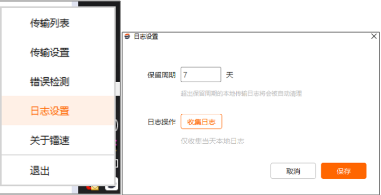 当传输数据量很多的时候,可以右键客户端图标点击日志设置,这里可以配置客户端本地的日志自动清理时间,设置更短的时间,清理的周期会更频繁。并且系统会自动将客户端本地的日志每间隔24小时进行压缩处理。还提供收集当天的日志,用于提供给镭速技术人员进行问题的排查定位。