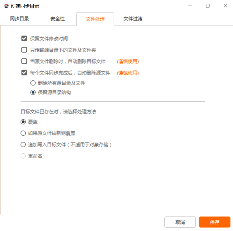 当创建同步任务时,选择文件处理方式时,新增了“当文件删除时,依然保留源目录结构”的文件处理方式。当系统同步完成后,将会自动删除源目录内的文件,但不会删除文件夹,依然会保持原有的文件夹结构。